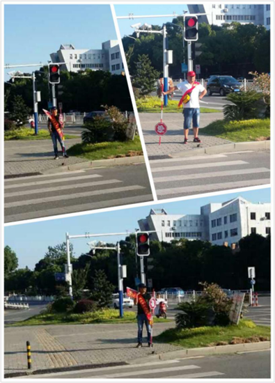 2017年7月16日,池州市供水公司組織交通志愿者參加安全文明交通志愿行動(dòng)。炎炎烈日,身浴熱浪,小紅帽志愿服務(wù)者手持交通勸導(dǎo)桿分別在清風(fēng)與東湖路、清風(fēng)路和長(zhǎng)江路交叉口,協(xié)助交警維持交通,車(chē)輛、行人井然有序通行。