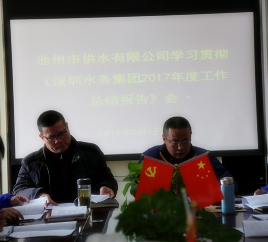 2018年1月29日深圳水務(wù)集團(tuán)公司2017年工作總結(jié)會議順利召開后,2月1日上午,池州市供水有限公司迅速組織班子成員及各部門負(fù)責(zé)人在公司三樓會議室集中學(xué)習(xí)深水集團(tuán)黨委書記、董事長胡嘉東所作的《2017年工作總結(jié)報(bào)告》。