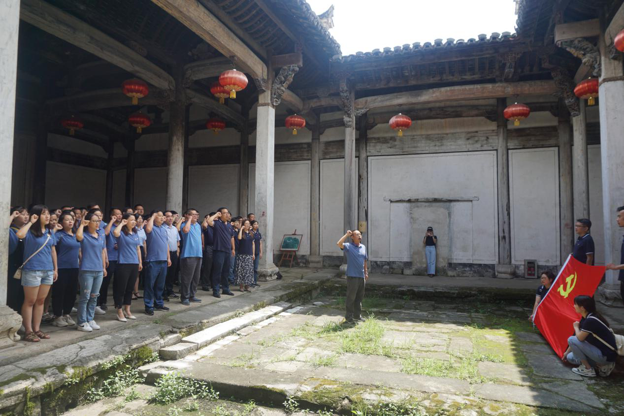 參觀完家風(fēng)家訓(xùn)館后,大家前往陵陽鎮(zhèn)北上抗日先遣隊駐地舊址。這里既是陳氏宗祠也是抗日先遣隊駐地舊址,1934年12月,紅軍北上抗日先遣隊曾在此宿營,司令部就設(shè)在陳氏宗祠中。大家認(rèn)真觀看一組組珍貴的歷史圖片和文獻資料,體會這棟古建筑里不屈不撓艱苦奮斗的時代痕跡,切身感受革命先烈對黨忠誠、無私奉獻、不懼犧牲的革命精神,全體黨員深受震撼,思想上受到一次深刻的洗禮。最后,在供水公司黨支部書記鐘誠的帶領(lǐng)下,全體黨員一道舉起右拳、面對黨旗、莊嚴(yán)宣誓。“我志愿加入中國共產(chǎn)黨,擁護黨的綱領(lǐng),遵守黨的章程……永不叛黨!币蛔忠痪洌H鏘有力,愛國愛黨之情油然而生。