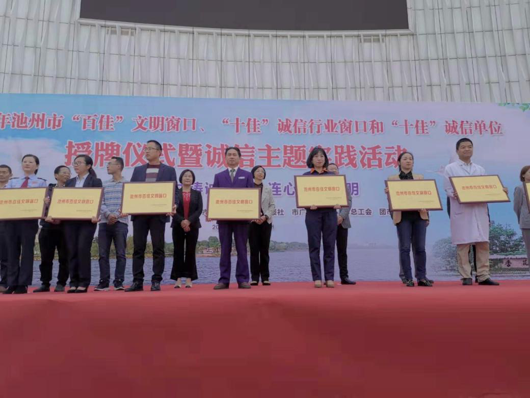 2019年10月18日上午10點(diǎn),市文明辦在遠(yuǎn)東國(guó)際廣場(chǎng)舉辦了池州市百佳文明窗口、十佳誠(chéng)信行業(yè)窗口和十佳誠(chéng)信單位授牌儀式暨誠(chéng)信主題實(shí)踐活動(dòng),池州市供水公司客戶服務(wù)中心被授予“池州市百佳文明窗口”稱號(hào)。此項(xiàng)榮譽(yù)的獲得代表了各級(jí)主管單位與社會(huì)大眾對(duì)池州市供水公司窗口服務(wù)工作的充分認(rèn)可,展示了供水公司良好的品牌形象。