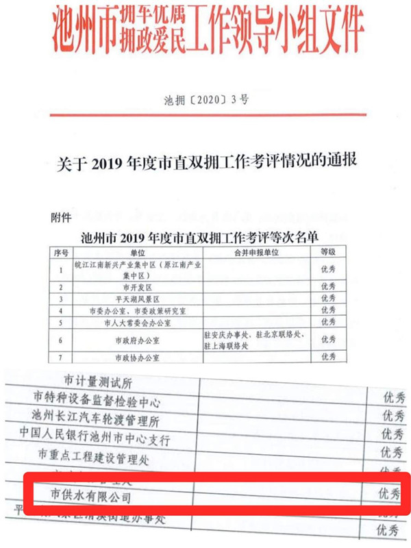 近日,池州市雙擁辦傳來好消息,池州市供水有限公司獲池州市2019年雙擁優(yōu)秀單位稱號,這是公司自2017年申報(bào)市雙擁優(yōu)秀單位以來連續(xù)三屆獲此殊榮。