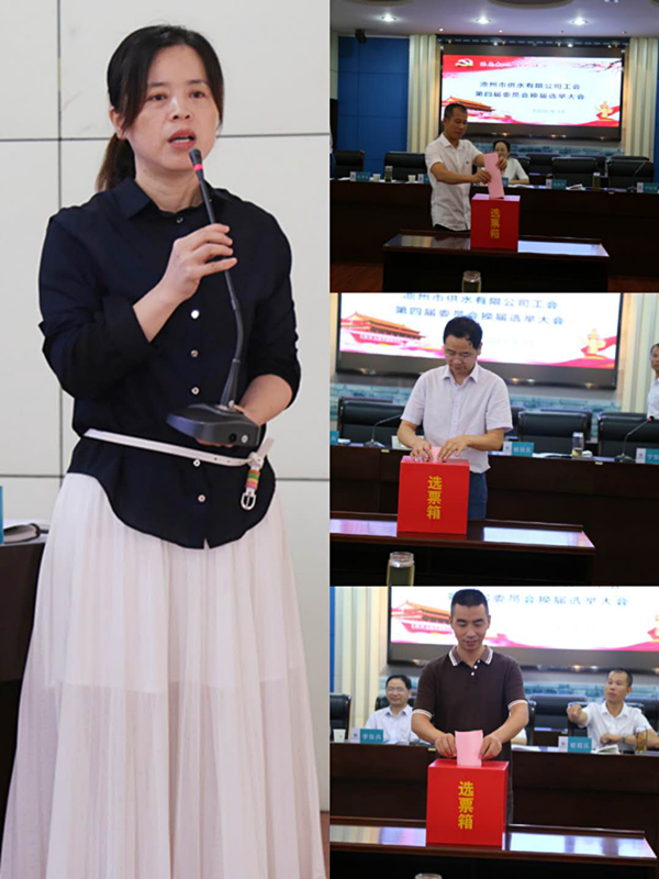 大會表決通過了《池州市供水有限公司第三屆工會委員會工作報告》和《池州市供水有限公司第三屆工會委員會財務(wù)報告》,并通過了監(jiān)票人、計票人、唱票人名單,大會采用無記名投票的方式選舉產(chǎn)生了新一屆工會委員:施潔(工會主席)、章超、劉朝輝、包亮、汪華穎;新一屆工會經(jīng)費審查委員會:趙情(主任)、黃曉芬、左嵐。新當(dāng)選的工會主席施潔同志進行了表態(tài)發(fā)言。