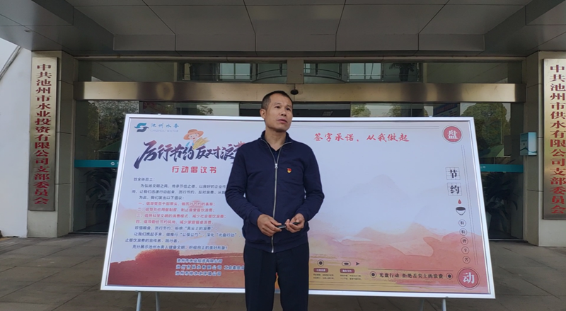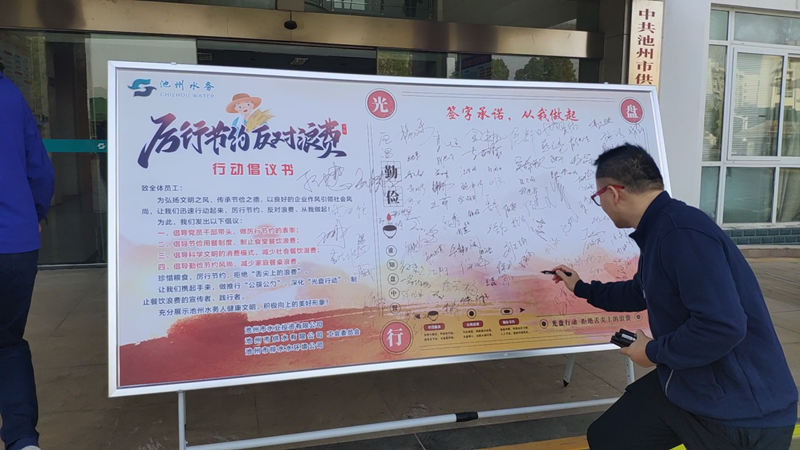 食為政首,糧安天下,為深入貫徹落實(shí)習(xí)近平總書記對(duì)制止餐飲浪費(fèi)行為作出的重要指示精神,響應(yīng)國(guó)家安全戰(zhàn)略,進(jìn)一步弘揚(yáng)中華民族勤儉節(jié)約的傳統(tǒng)美德,牢固樹立節(jié)約光榮、浪費(fèi)可恥的意識(shí),11月9日上午8點(diǎn),市供水有限公司聯(lián)合池州水業(yè)、池州排水、池州水環(huán)境公司在供水公司大樓前簡(jiǎn)單而隆重地開展“厲行節(jié)約,反對(duì)浪費(fèi)”簽名承諾活動(dòng)。
