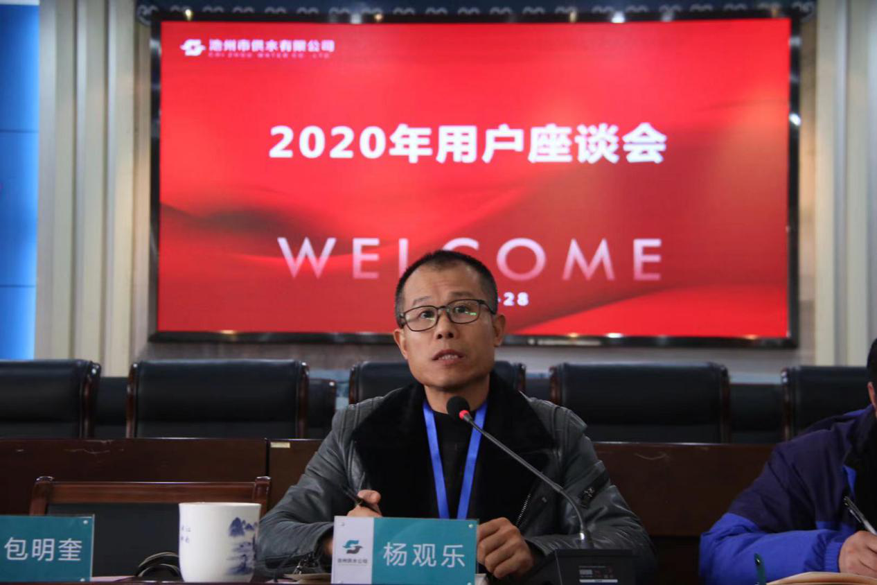為更好服務用戶,實現(xiàn)池州供水事業(yè)高質(zhì)量發(fā)展,提升市民的幸福感、獲得感、安全感,12月28日下午,池州市供水有限公司召開了用戶座談會。會議邀請了媒體、社區(qū)委、園區(qū)企業(yè)、醫(yī)院、高校、物業(yè)公司、普通群眾等代表齊聚供水公司會議室,向客戶代表介紹池州供水發(fā)展現(xiàn)狀,并誠懇聽取各界代表對供水提出的意見和建議,以便把服務工作做到最好。池州市公用事業(yè)管理局局長包明奎、池州供水公司董事長楊觀樂、總經(jīng)理李張兵等,以及公司相關部門代表參加了會議,座談會由公司副總經(jīng)理寧加寶主持。