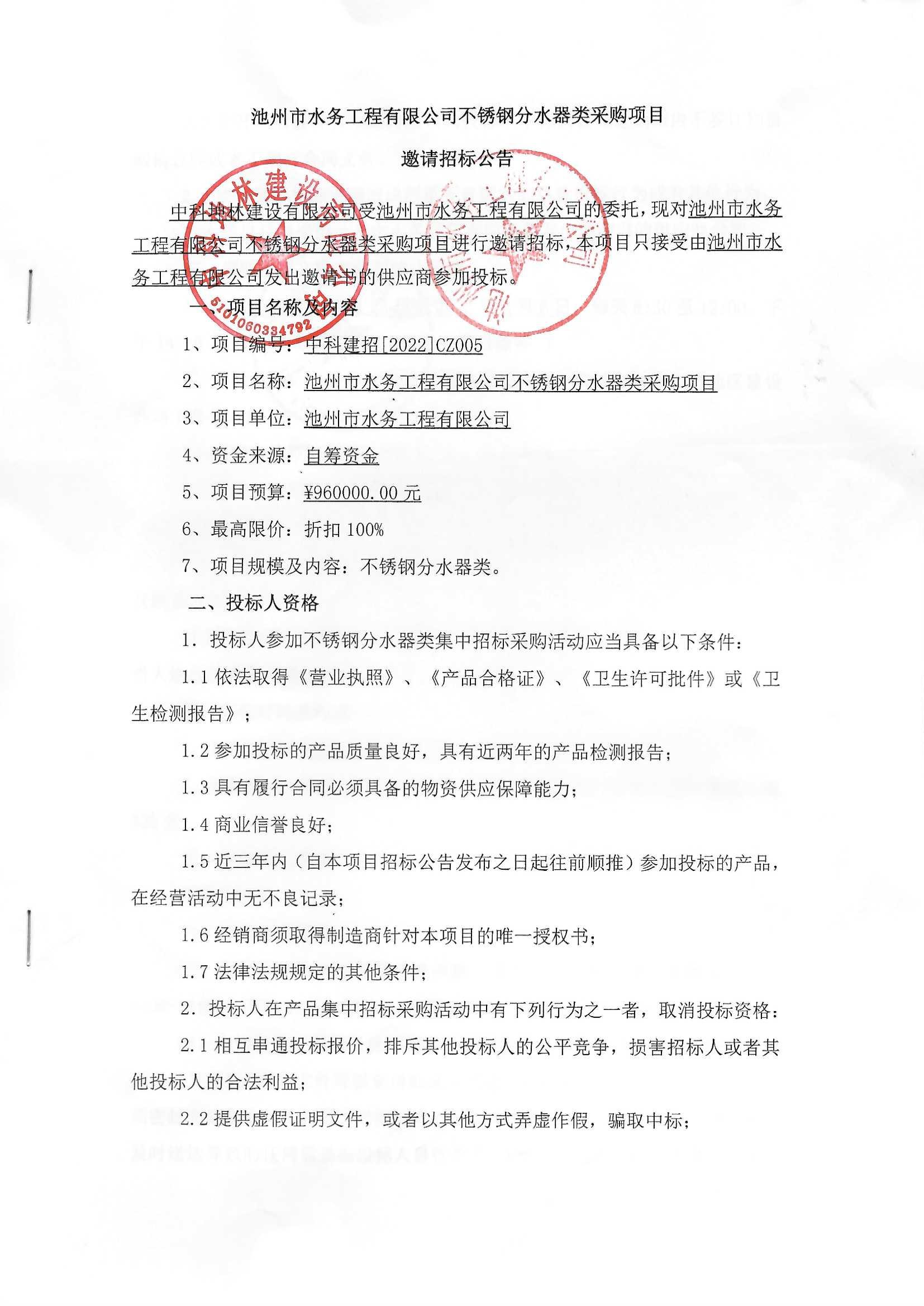 | 池州市水務(wù)工程有限公司不銹鋼分水器類采購項目邀請招標公告 | |