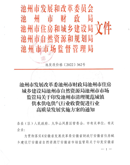 池州市發(fā)展改革委池州市財(cái)政局池州市市場 監(jiān)管局等部門關(guān)于印發(fā)池州市清理規(guī)范城鎮(zhèn) 供水供電供氣行業(yè)收費(fèi)