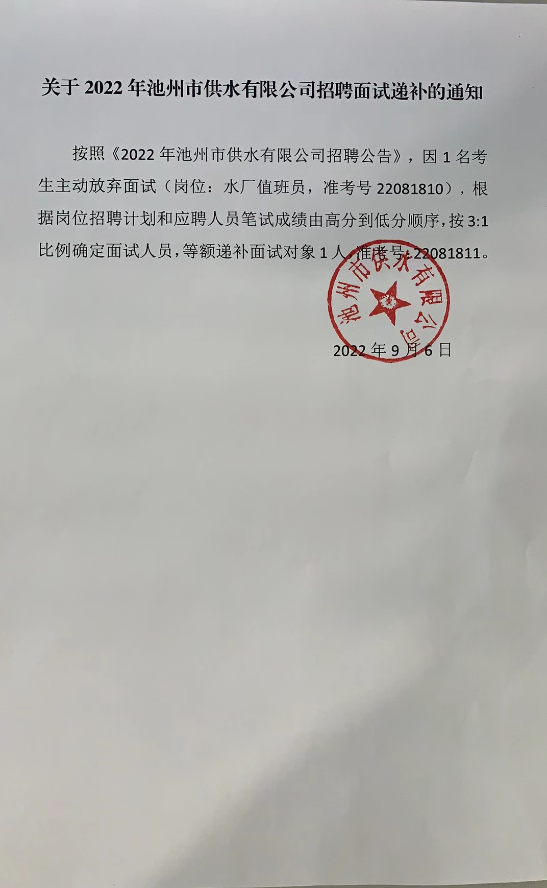 | 關(guān)于2022年池州市供水有限公司招聘面試遞補(bǔ)的通知 | |