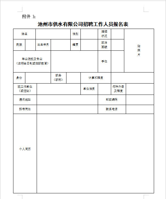 3、2022年池州市供水有限公司招聘工作人員報(bào)名表
