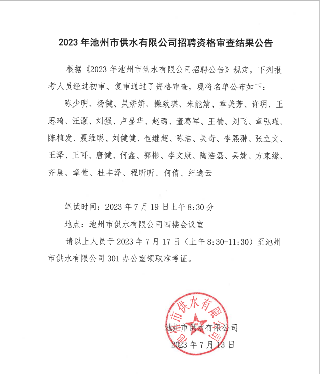 | 2023年池州市供水有限公司招聘資格審查結(jié)果公告 | |