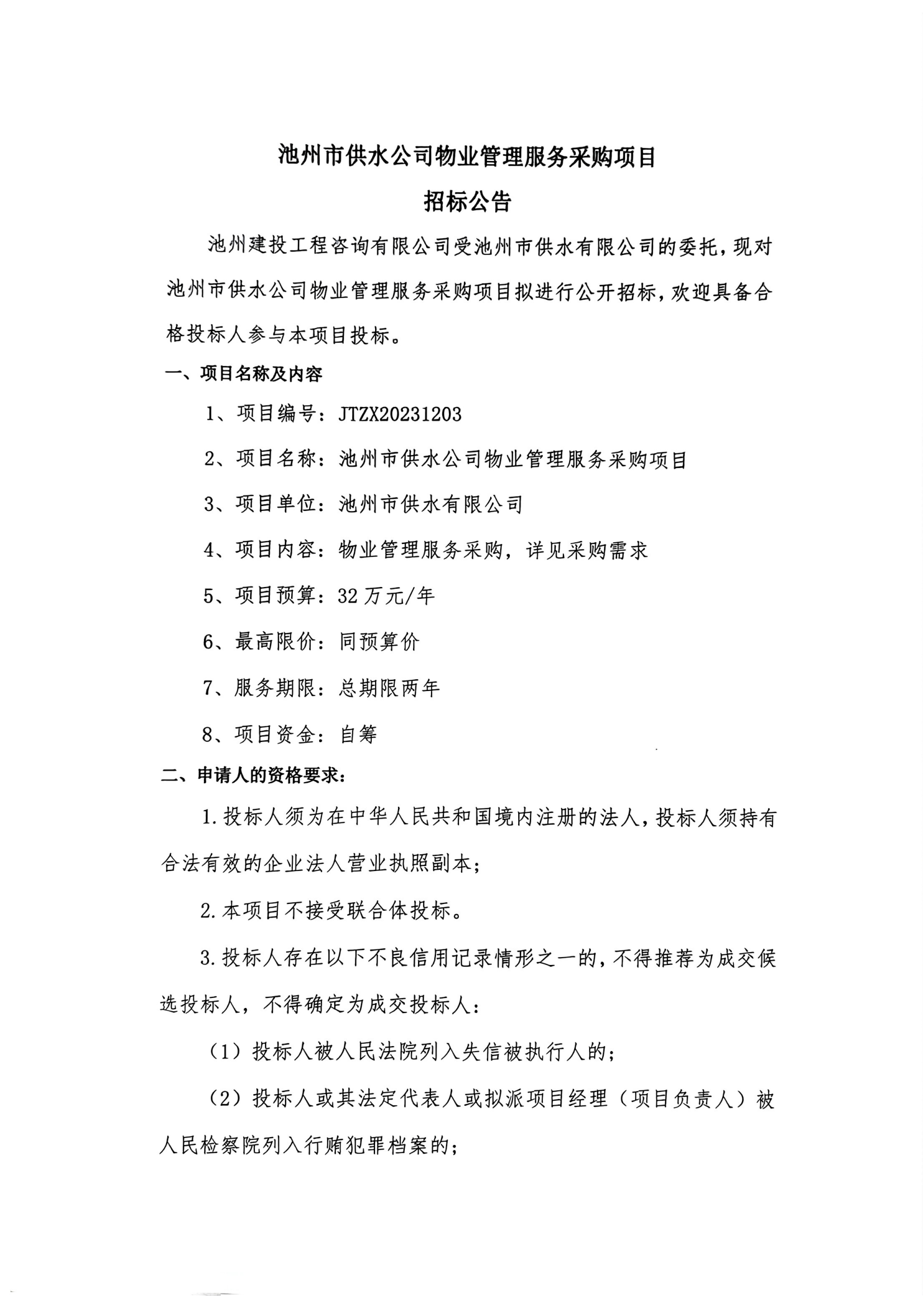 | 池州市供水公司物業(yè)管理服務采購項目招標公告 | |