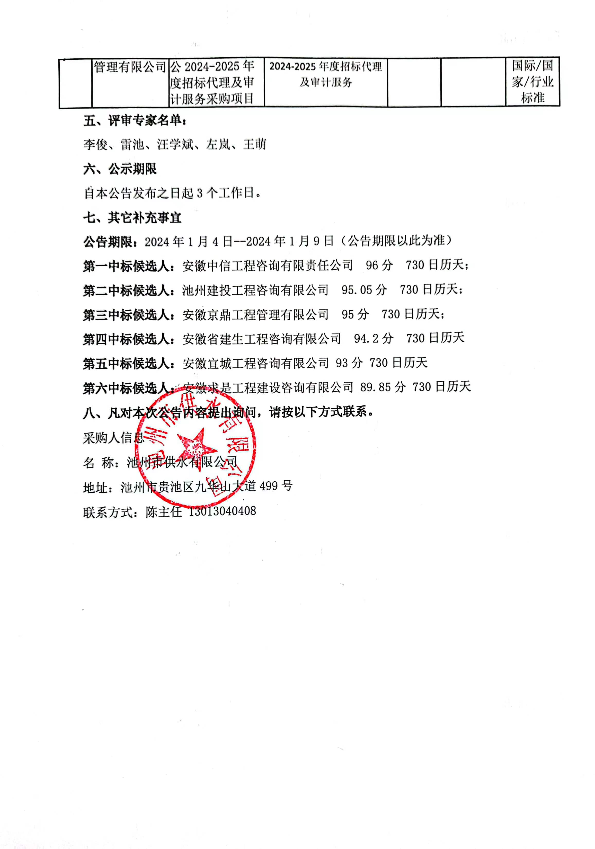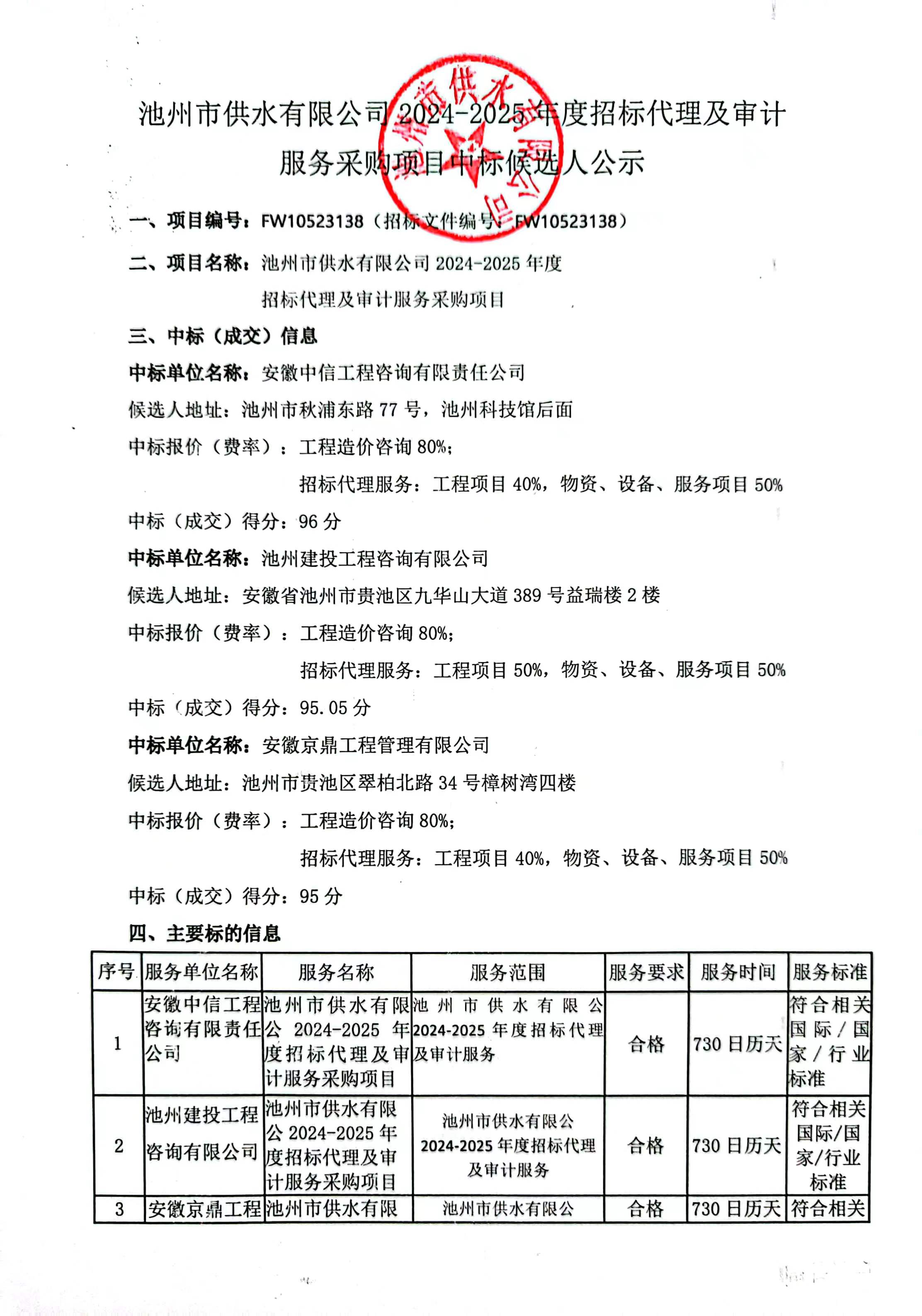 | 池州市供水有限公司招標(biāo)代理及零星項(xiàng)目審計服務(wù)采購項(xiàng)目中標(biāo)候選人公示 | |