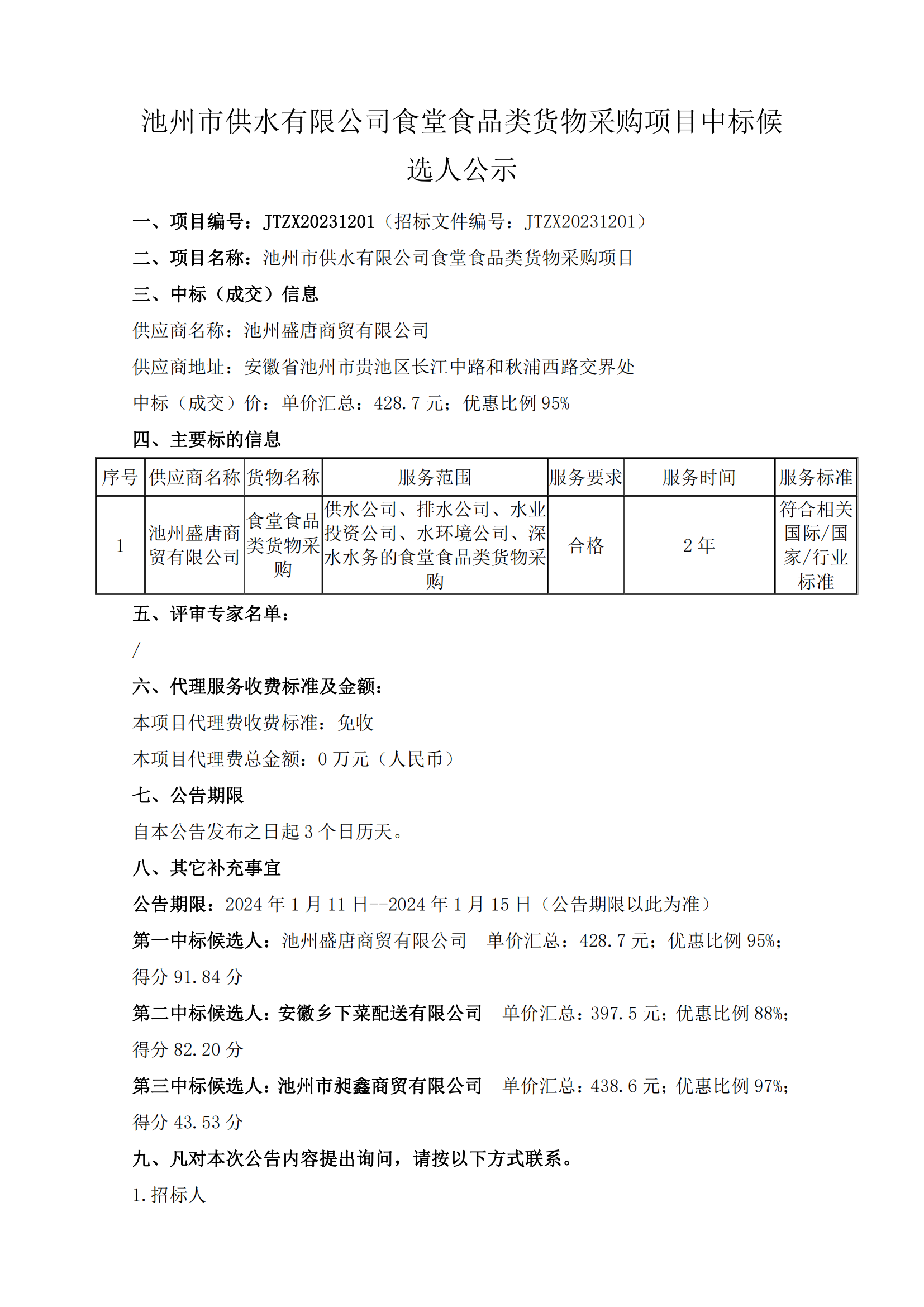 | 池州市供水有限公司食堂食品類貨物采購項目中標候選人公示 | |