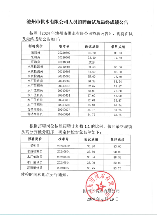 | 池州市供水有限公司人員招聘面試及最終成績(jī)公告 | |