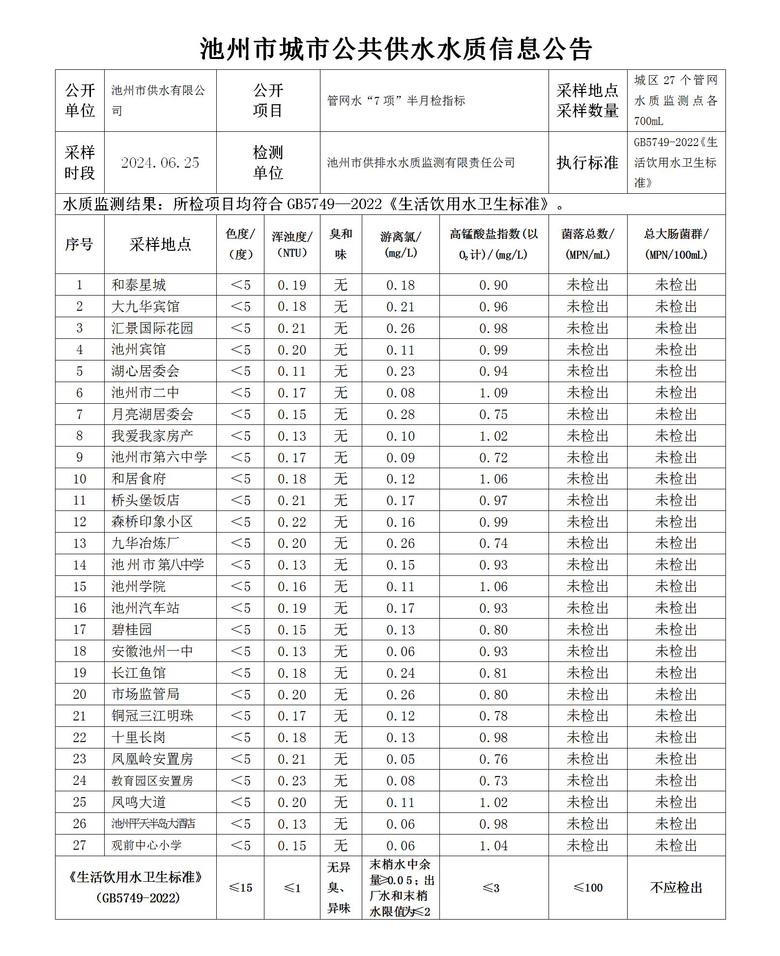 | 池州市城市公共供水水質(zhì)信息公告管網(wǎng)水“7項(xiàng)”半月檢指標(biāo)2024.06.25 | |