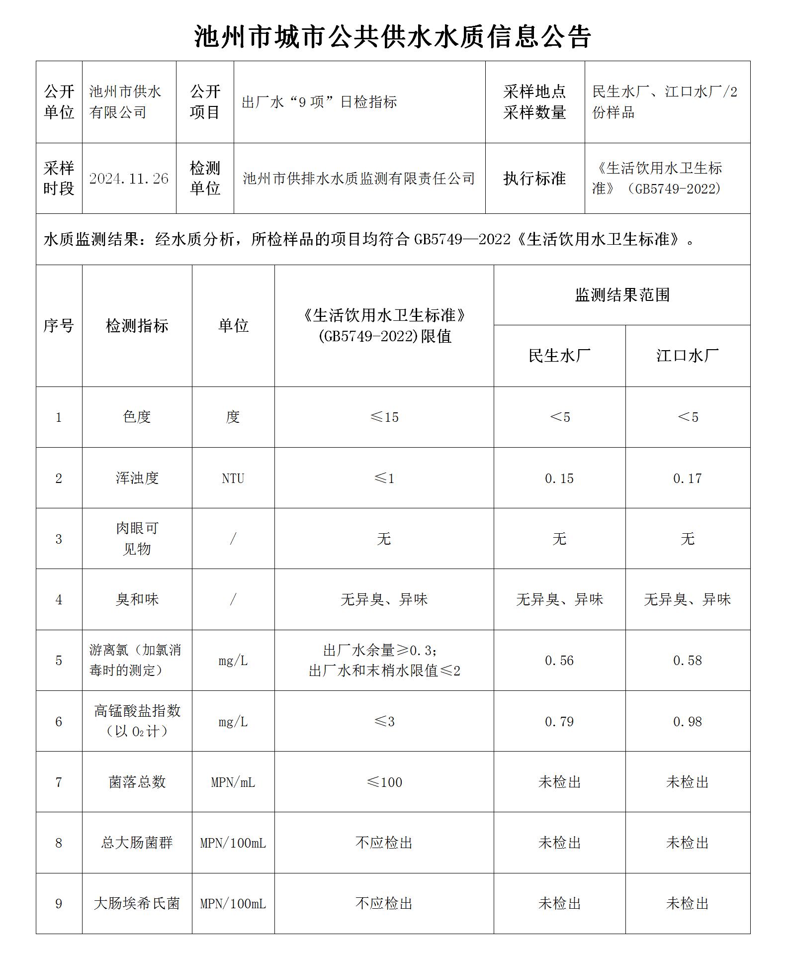 | 池州市城市公共供水水質(zhì)信息公告出廠水“9項”日檢指標2024.11.26 | |