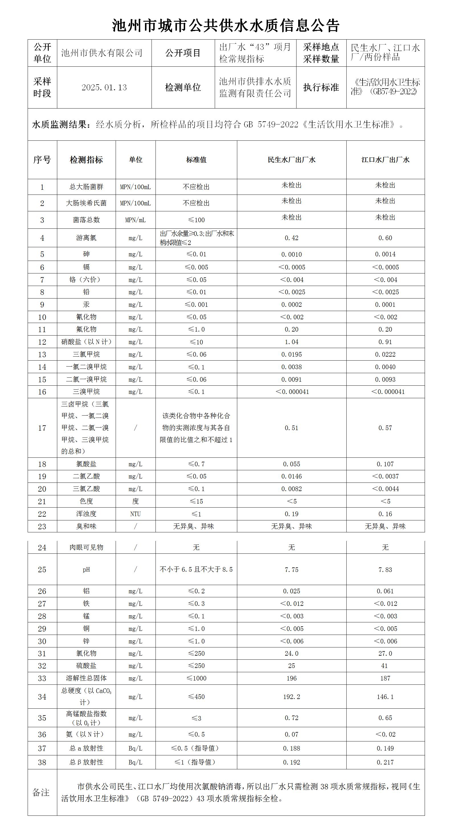 | 池州市城市公共供水水質(zhì)信息公告1月份出廠水月檢常規(guī)指標(biāo) | |