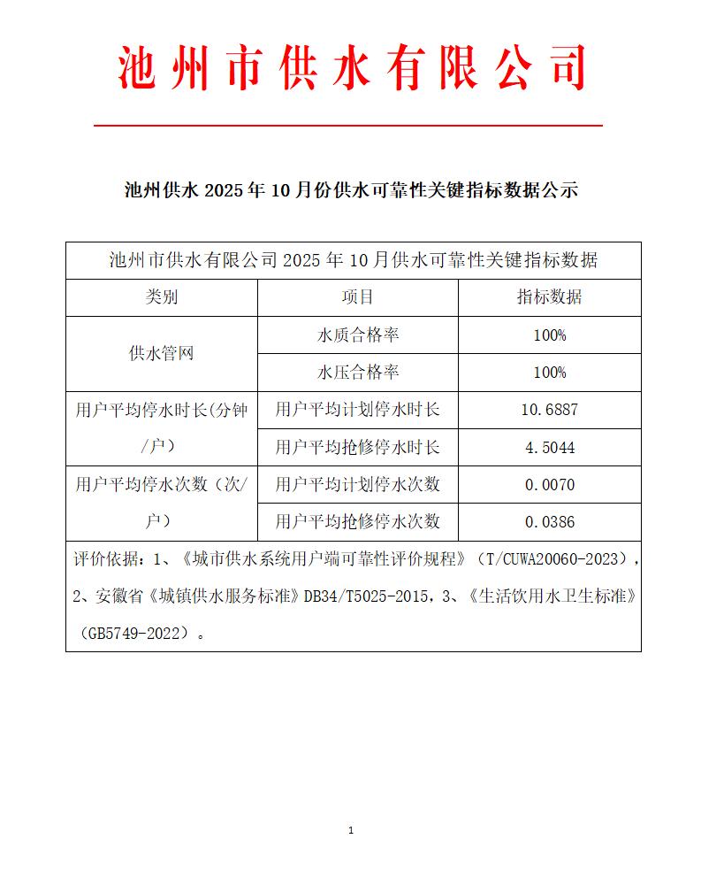 | 池州供水2025年10月份供水可靠性關(guān)鍵指標(biāo)數(shù)據(jù)公示 | |