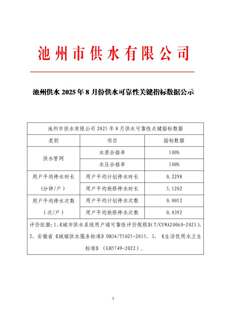 | 池州供水2025年8月份供水可靠性關(guān)鍵指標(biāo)數(shù)據(jù)公示 | |