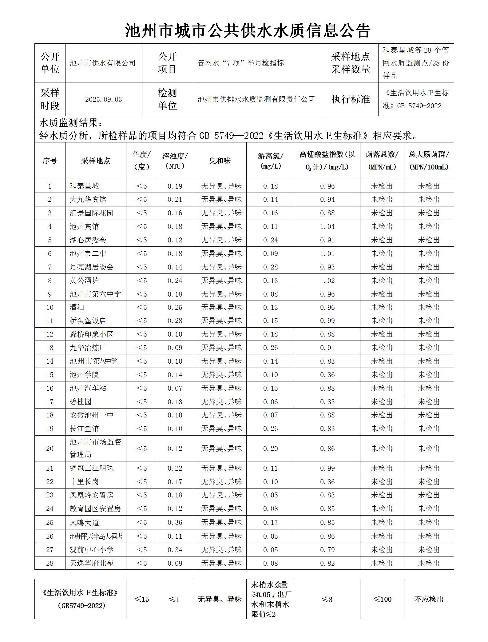 | 池州市城市公共供水水質(zhì)信息公告管網(wǎng)水“7項(xiàng)”半月檢指標(biāo)20250903 | |