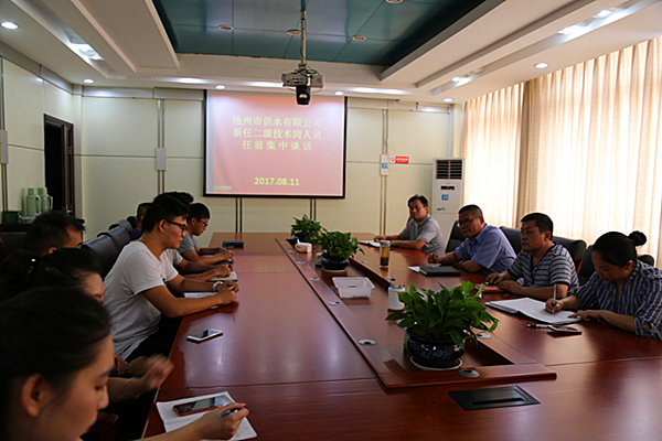 2017年8月11日下午,池州市供水有限公司新任12名二級技術(shù)崗人員接受任前集中談話。公司總經(jīng)理吳小平及領(lǐng)導(dǎo)班子成員寧加寶、包洪全、王忠榮參加了談話。