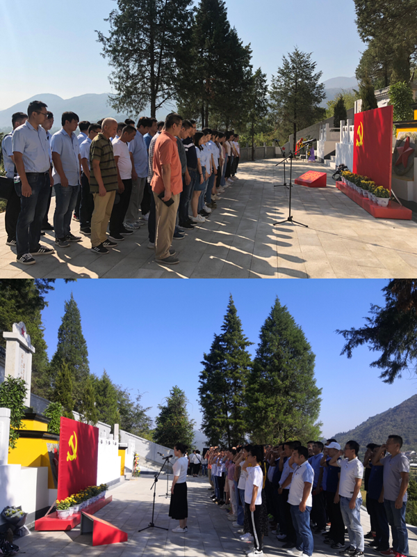 松柏環(huán)抱,階梯整潔,在巍然莊嚴(yán)的棠溪留田年關(guān)暴動(dòng)烈士陵園,全體黨員懷著崇敬的心情向革命烈士鞠躬默哀致敬,表達(dá)革命烈士的深切緬懷和無(wú)限敬仰。面對(duì)鮮紅的中國(guó)共產(chǎn)黨黨旗,池州供水黨支部委員施潔領(lǐng)誓,全體黨員緊握拳頭,重溫入黨誓詞,以堅(jiān)定有力地宣誓聲,表達(dá)矢志不渝守初心、奮發(fā)有為擔(dān)使命的堅(jiān)定決心。
